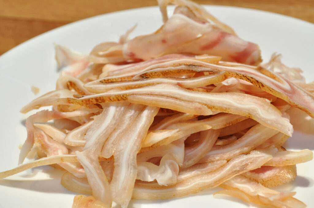 Some dishes truly encompass what it means to cook well and pig’s ears (ミミガー mimiga) is one such example. Pig’s ears are torched and simmered long and low until the tough ears become tender and delicious. The prepared ears are then thinly sliced and often served with a ponzu sauce, a peanut sauce or even a sweetened vinegar sauce.