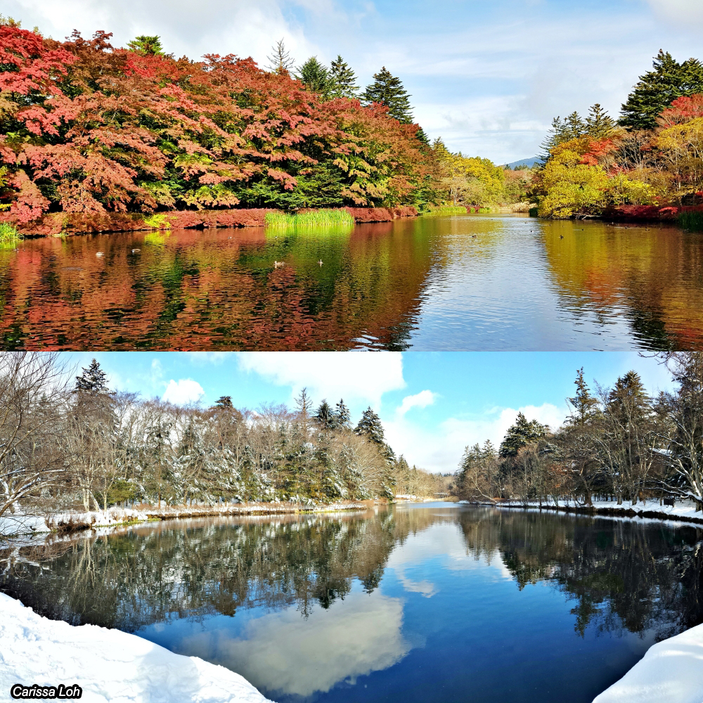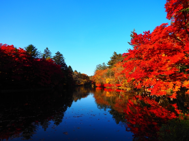 Kumobaike Pond is another major natural attraction of Karuizawa alongside Shiraito Falls. It is also known as “Swan Lake” (スワンレイク) but ironically there are no swans on it. What’s outstanding about this pond is its mirroring effect with its surroundings: in the summer, the water reflects the vibrant greenery of the surrounding trees; in the autumn, it vividly mirrors the fiery red and golden leaves of the foliage; and in winter, visitors can see it reflecting the white snow covering the surrounding trees, contrasted with the azure-coloured sky.