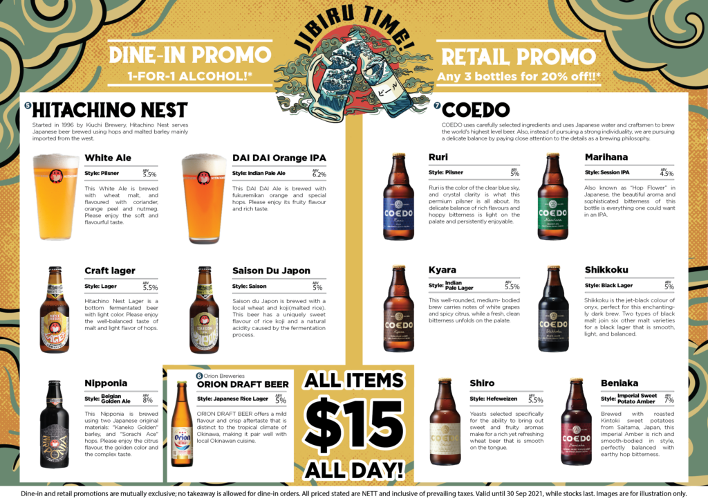If you thought the list ends here, you’re wrong. At Jibiru Time, you’ll also be able to relish more beer from three other Japanese local breweries that have already cemented their places as craft beer staples from Japan such as Hitachino Nest from Kiuchi Brewery in Ibaraki Prefecture, COEDO BREWERY from Saitama Prefecture, and ORION BREWERIES from Okinawa Prefecture.