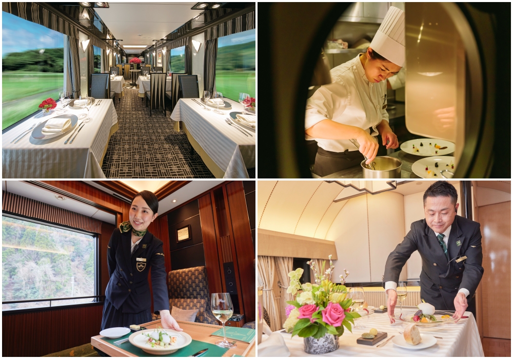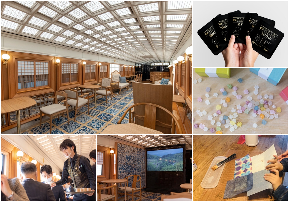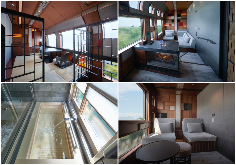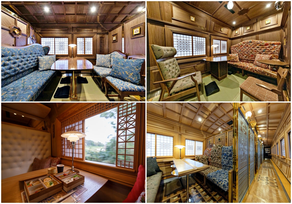 Like the Seven Stars in Kyushu, the interiors of the train’s six cars are a blend of modern Western styles and traditional Japanese styles, with features such as intricate Okawa kumiko latticework designs and shoji screen windows.