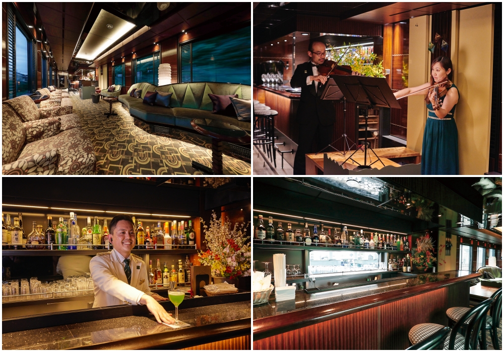 The lounge car Blue Moon (ラウンジカー「ブルームーン」) in Car 1 features swivelling chairs and elegant sofas, and is a place where guests can relax and enjoy live musical performances.