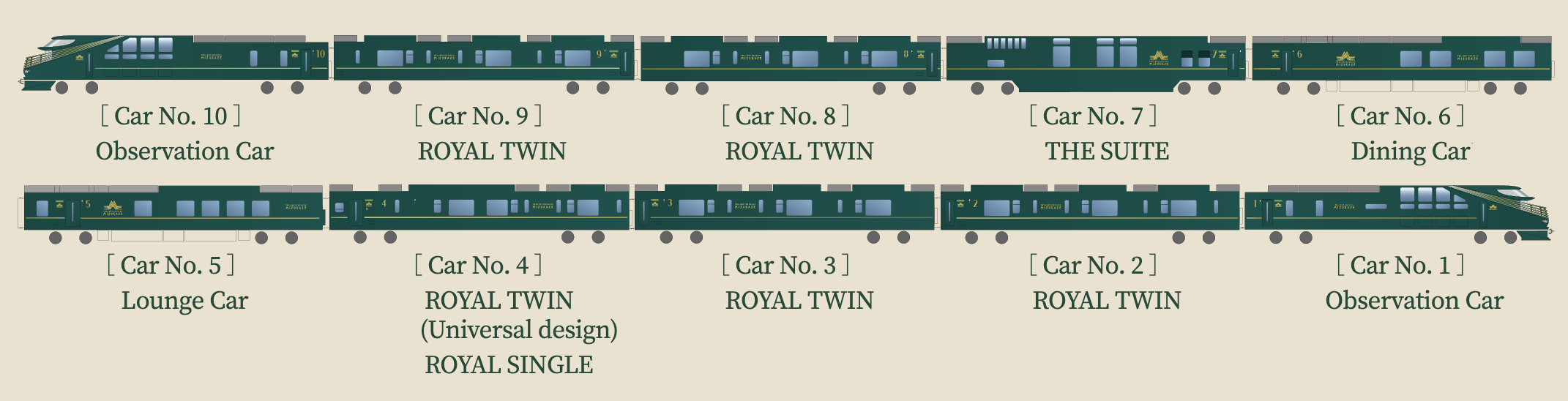 12 Royal Twin rooms occupy Cars 2, 3, 8, and 9, while Car 4 houses 2 Royal Single rooms and 1 wheelchair-accessible Royal Twin room.