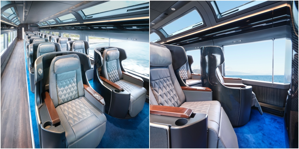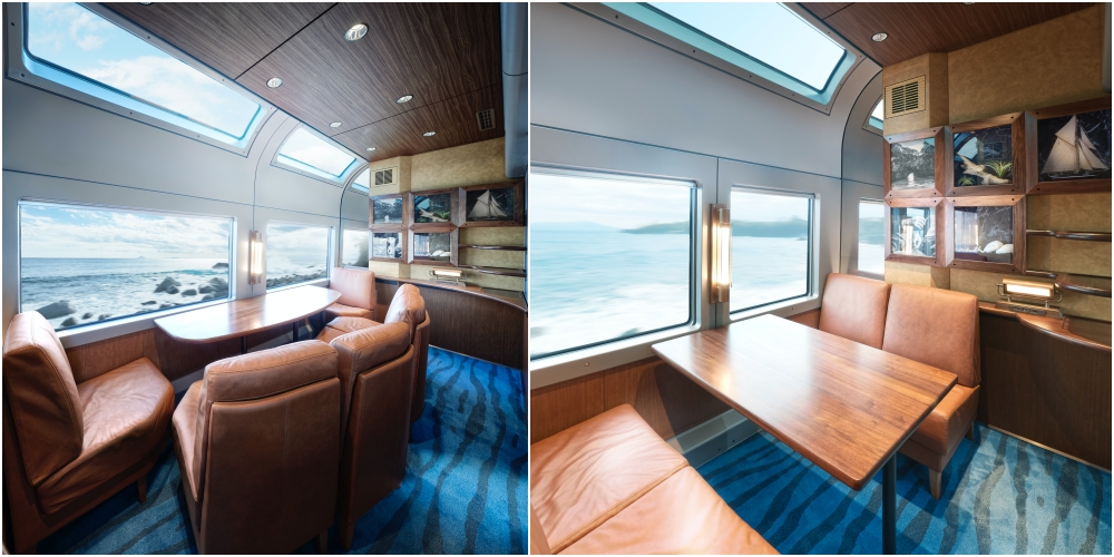 The SAPHIR ODORIKO comprises of eight cars, with Car 1 being the coveted Premium Green Car. The car’s windows are large and wide, with added skylights for a more expansive view. Providing extra space and privacy, there are only two single seats per row, all on the side facing the sea. These comfortable and plush leather seats can even swivel towards the window to give passengers an even better view.