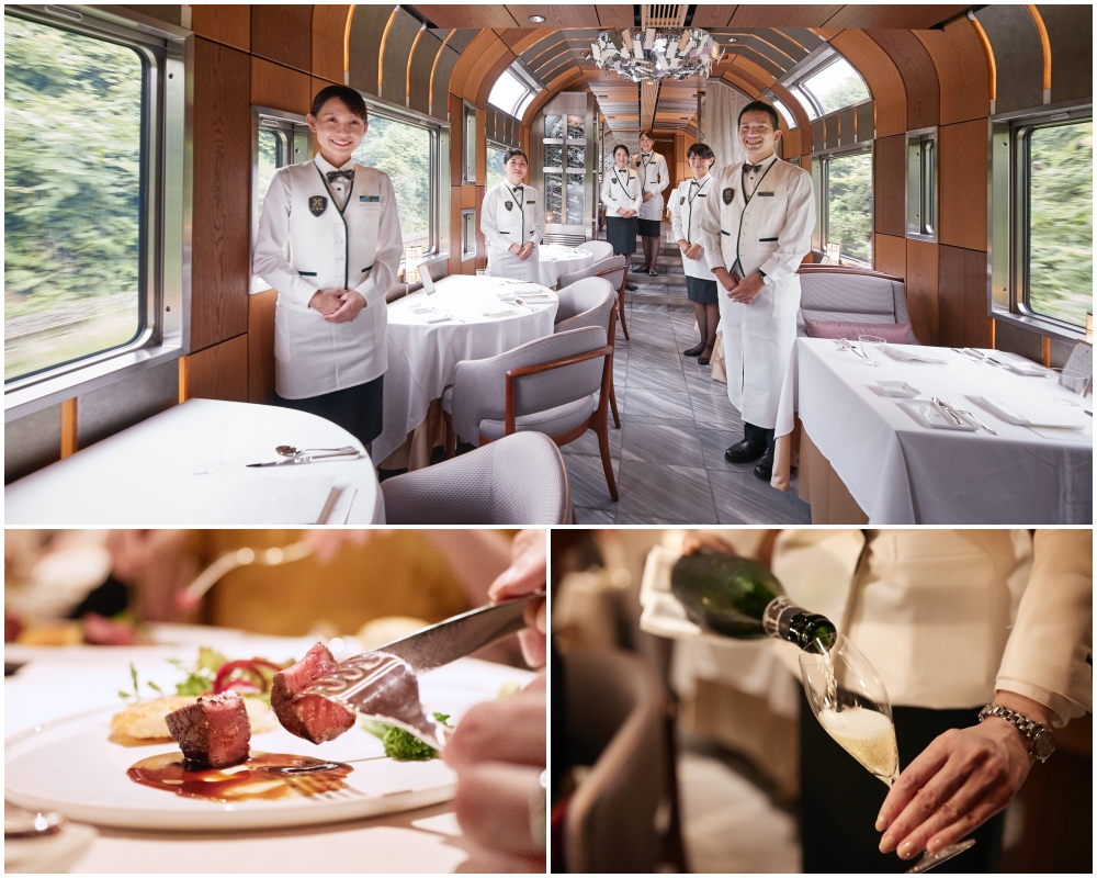 The dining car, Diner Pleiades (ダイナープレヤデス), is located in Car 6 and has a very special feature: an open kitchen. Guests can witness how the food artisans meticulously prepare their meals from the window.