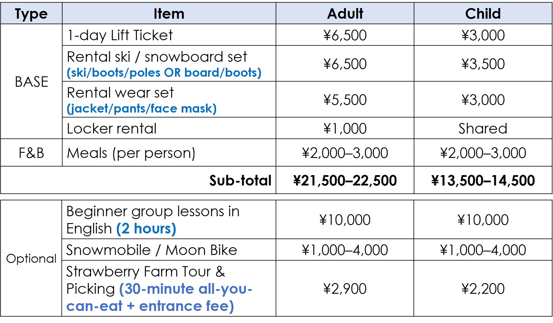 If you’re looking at a 2-day course, the general rule of thumb is to simply multiply your costs by 2, while taking into consideration other activities in the Yuzawa area.