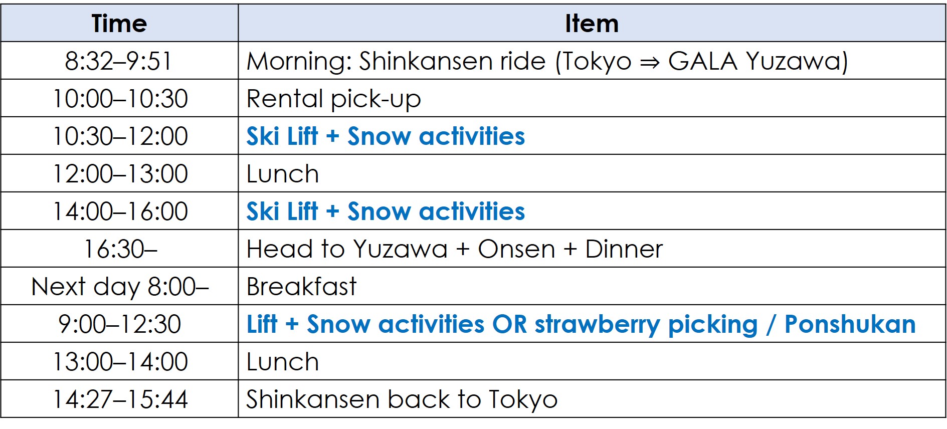 If you want to spend more time in Yuzawa by staying overnight, a 2-day itinerary will let you wake up just a bit later on the first day, and still leave you with about half a day left in Tokyo after returning on the 2nd day. Of course, feel free to adjust accordingly!