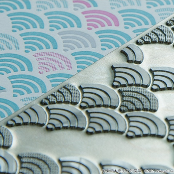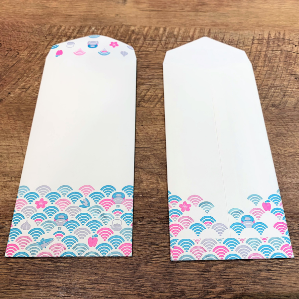 This envelope features a playful combination of the E5 Series Hayabusa Shinkansen and traditional Japanese patterns (wagara).