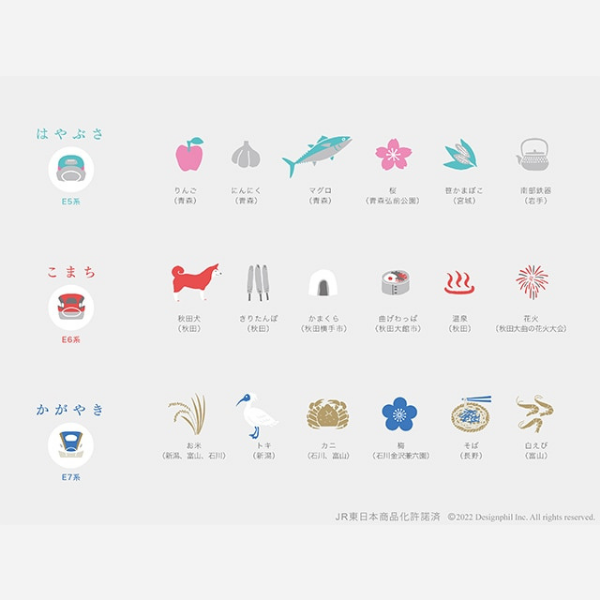 Illustrated motifs include garlic, tuna, apples, cherry blossoms, sasa-kamaboko (fish cake), and Nambu ironware, representing regions along the Tohoku and Hokkaido Shinkansen line.