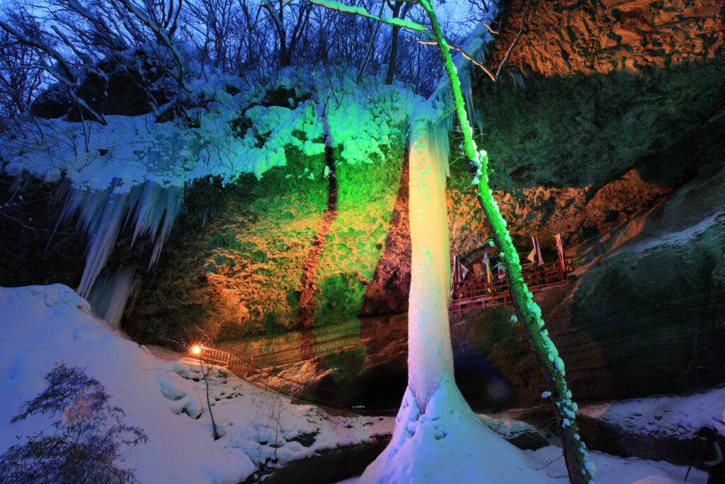 When conditions like temperature and water pressure align, the falls can freeze solid into a single pillar. Every February, it is illuminated in three colours—blue, green, and yellow—creating a fantastical world of ice. Updates on the waterfall’s condition are posted on the village’s website. While the current illumination uses three colours as standard, plans for different colours are currently being considered.