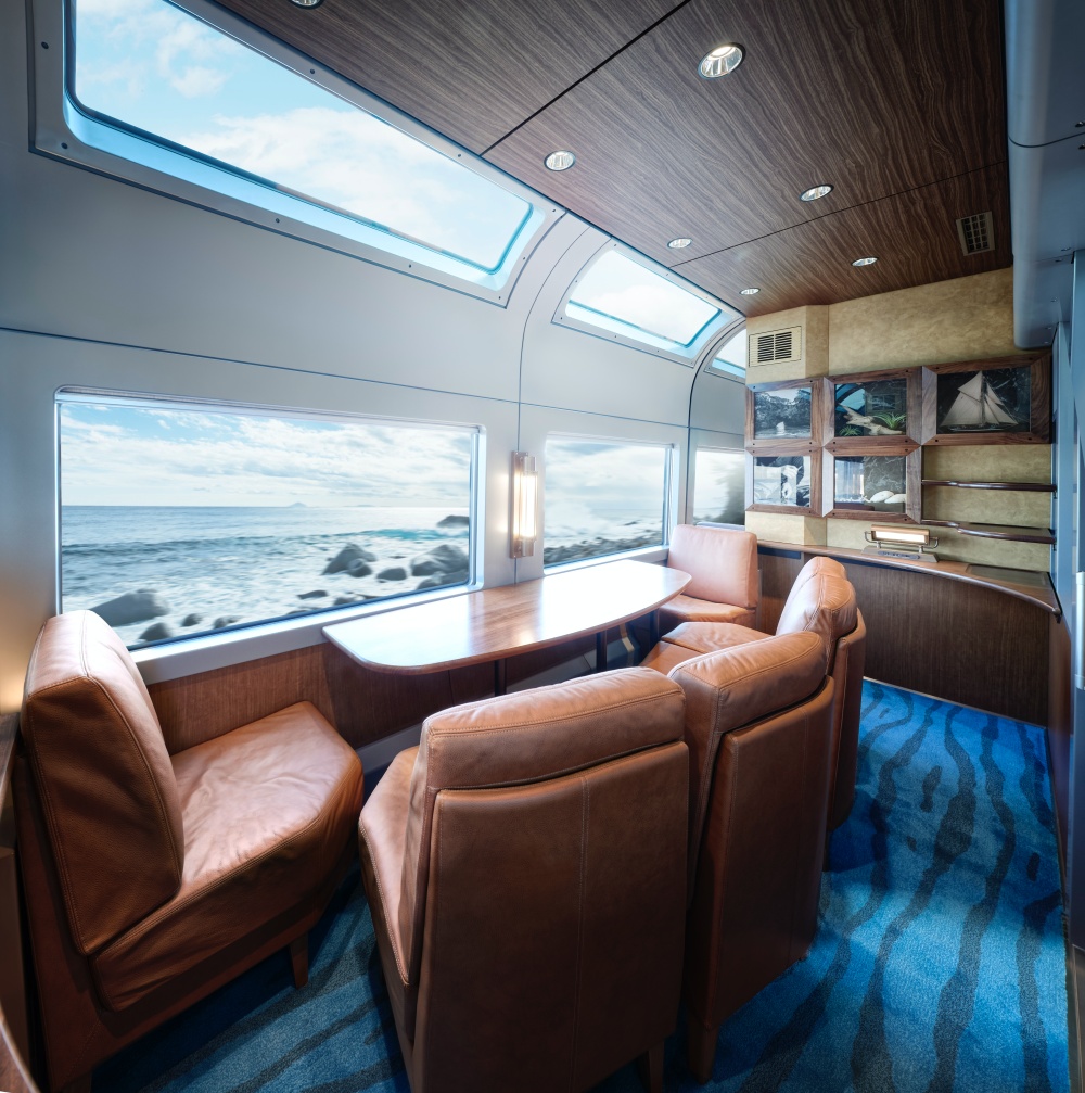 Beautifully decorated with plush leather seats, spacious tables, warm wooden finishes, and rich blue carpets, Green Car Private Compartments have enormous windows that face the sea, allowing for unobstructed views of the scenery outside.