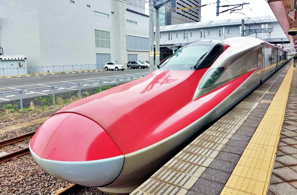 Trains serving the Akita Shinkansen are easily recognisable—beautiful, bright red, narrow-bodied E6 series “Komachi” (こまち) trains.