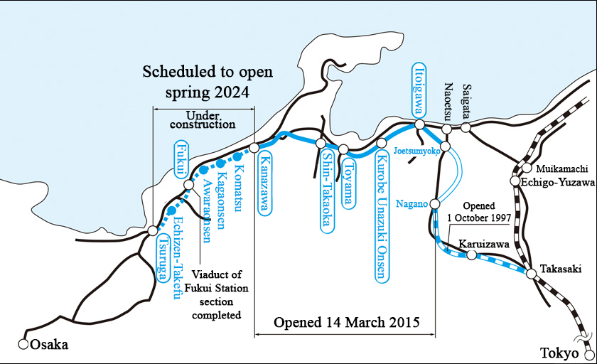 From Tokyo Station, Hokuriku Shinkansen train services run along the same tracks as the Joetsu Shinkansen, and it is only at Takasaki Station that they diverge. The current Hokuriku Shinkansen was opened in two stages, with extensions still under construction:
