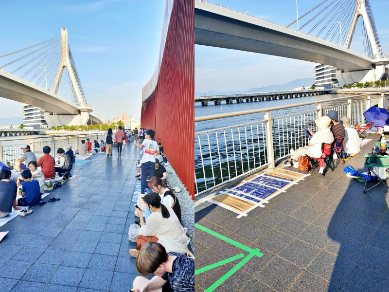 สำหรับการชมการแสดงดอกไม้ไฟและขบวนแห่เรือปิดงาน จะมีที่นั่งบนท่าเรือให้คุณซื้อตั๋วเข้าไปนั่งได้ ที่นั่งเหล่านี้จะหันหน้าเข้าหาอ่าวและเป็นทำเลให้คุณได้ชมวิวดอกไม้ไฟและโคมที่ลอยผ่านไปได้ใกล้ๆ โดยไม่มีอะไรมาบัง ซึ่งฉันได้เพื่อนๆ จากโมริโอกะช่วยให้ฉันได้ที่นั่งในทำเลนี้ด้วย!