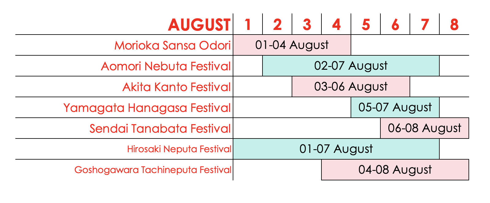 ถ้าเป็นไปได้ ฉันแนะนำให้คุณมาเที่ยวโทโฮคุในช่วงฤดูร้อนเป็นอย่างยิ่ง โดยช่วงนั้นจะเป็นช่วงที่เมืองต่างๆ มีชีวิตชีวาขึ้นมาด้วยบรรยากาศแห่งงานเทศกาล! นอกจากเทศกาลเนบูตะต่างๆ แล้ว โทโฮคุยังยังเป็นแหล่งรวมเทศกาลฤดูร้อนมากมายที่จัดขึ้นในช่วงสัปดาห์เดียวกัน (สัปดาห์แรกของเดือนสิงหาคม) และแต่ละเทศกาลนั้นทั้งอลังการและสนุกสนานไม่แพ้กันเลย