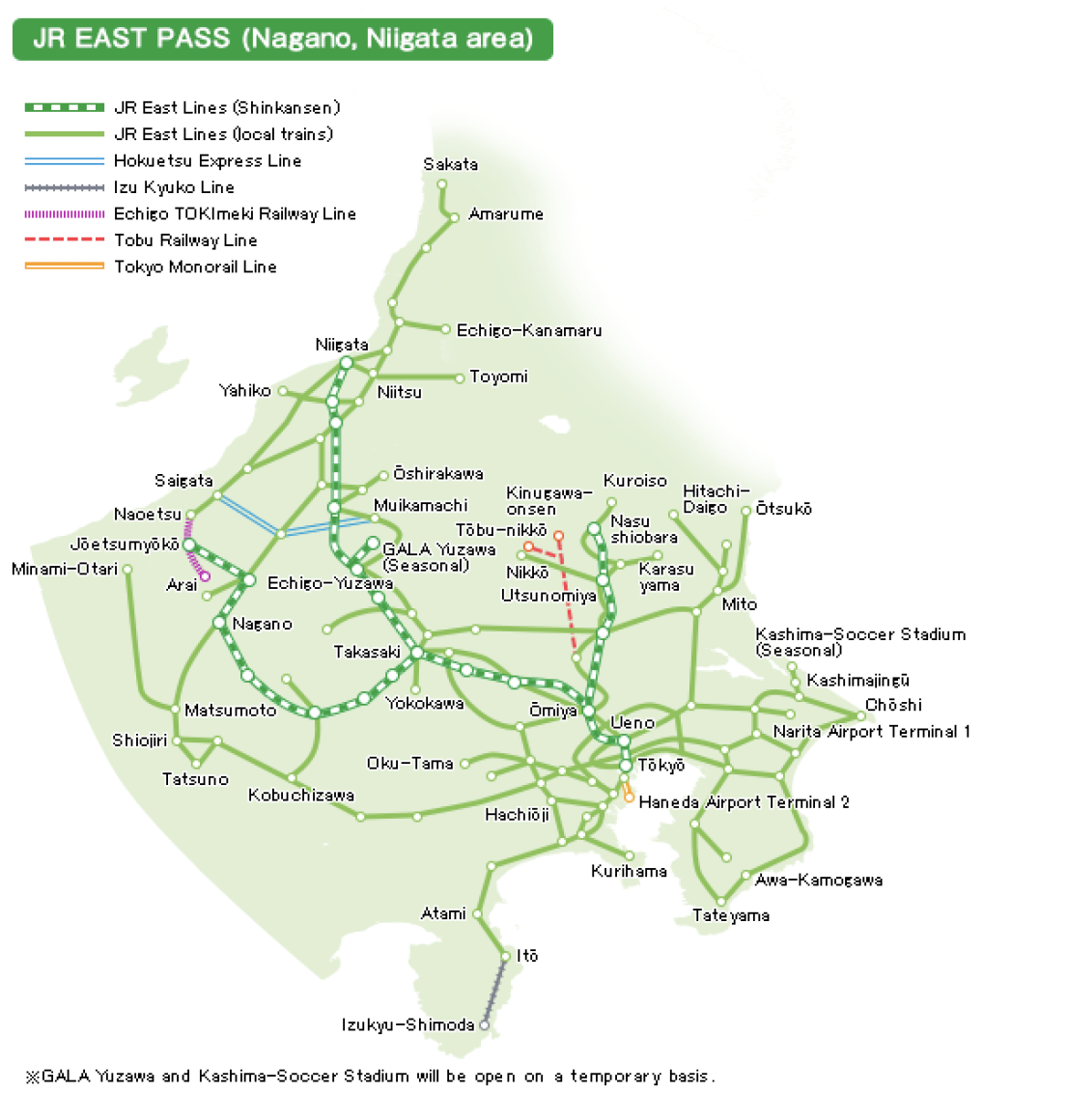 ตั๋ว JR EAST PASS (Nagano, Niigata area) เป็นตั๋วที่ปลดล็อคให้เดินทางได้อย่างไม่จำกัดรอบในทางรถไฟที่ตั๋วครอบคลุมตั้งแต่โตเกียวไปยังพื้นที่ภูมิภาคคันโตที่อยู่รอบๆ รวมถึงจังหวัดนีงาตะและนากาโนะ เป็นตั๋วที่แนะนำสำหรับนักท่องเที่ยวที่ต้องการไปเยือนสถานที่ต่างๆ ในภูมิภาคชินเอทสึ เช่น ฮาคุบะ มัตสึชิโระ หรืออียามะ ในจังหวัดนากาโนะ, และเมืองนีงาตะหรือเกาะซาโดะในจังหวัดนีงาตะ รวมทั้งสถานที่อื่น ๆ อีกมากมาย