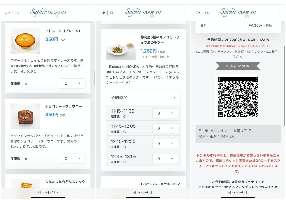 ด้วยความที่เป็นรถไฟใหม่ SAPHIR ODORIKO ก็มีเทคโนโลยีใหม่ด้วยเช่นกัน ซึ่งกำหนดให้การสั่งอาหารและการชำระเงินทั้งหมดต้องผ่านเว็บไซต์ SAPHIR Pay (เข้าได้ด้วยสมาร์ทโฟนเท่านั้น) เพียงเลือกอาหารที่คุณอยากสั่งจากเมนู จ่ายด้วยบัตรเครดิต และระบบจะออก QR โค้ดให้ โดยนำ QR โค้ดนี้ไปแสดงต่อพนักงานที่ห้องอาหาร แล้วเขาก็จะนำออร์เดอร์ของคุณมาให้