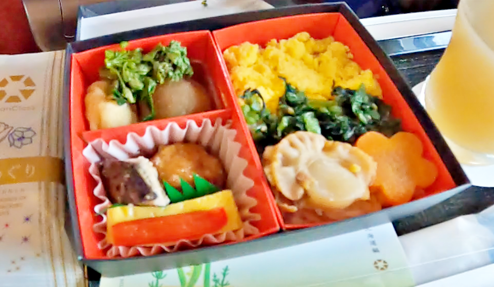 ทริปเดินทางด้วย Tohoku Shinkansen ของฉันนั้นอยู่ในช่วงฤดูใบไม้ผลิ และเมนูนั้นมีอาหารขนาดพอดีคำหลากหลายแบบ เช่นหอยเชลล์ตุ๋น กุ้งดอง ปลาแม็คเคอร์เรลย่างงา ลูกชิ้นไก่ ออมเล็ตสไตล์ญี่ปุ่น สารพัดผัก และอีกมากมาย ทุกๆ อย่างนั้นอร่อยมากและด้วยพื้นที่โต๊ะที่กว้างเป็นพิเศษทำให้การชิมอาหารนี้ต่างกับการกินเอกิเบ็นบนตู้รถไฟทั่วไปที่มีที่นั่งและโต๊ะที่เล็กกว่านี้โดยสิ้นเชิง