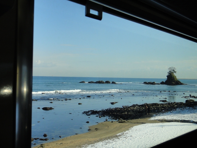 Slightly off the coast are two small rocky islands, Otoko-iwa (男岩) and Onna-iwa (女岩)—the tall trees growing on the latter making it the subject of many posters and images of the coast. Along the coast is Yoshitsune Rock (義経岩), so named because legend has it that Minamoto-no-Yoshitsune (源義経), one of the most celebrated characters in Japanese history, once waited under the rock for a passing shower to stop while en route to Hiraizumi (平泉) in Iwate.