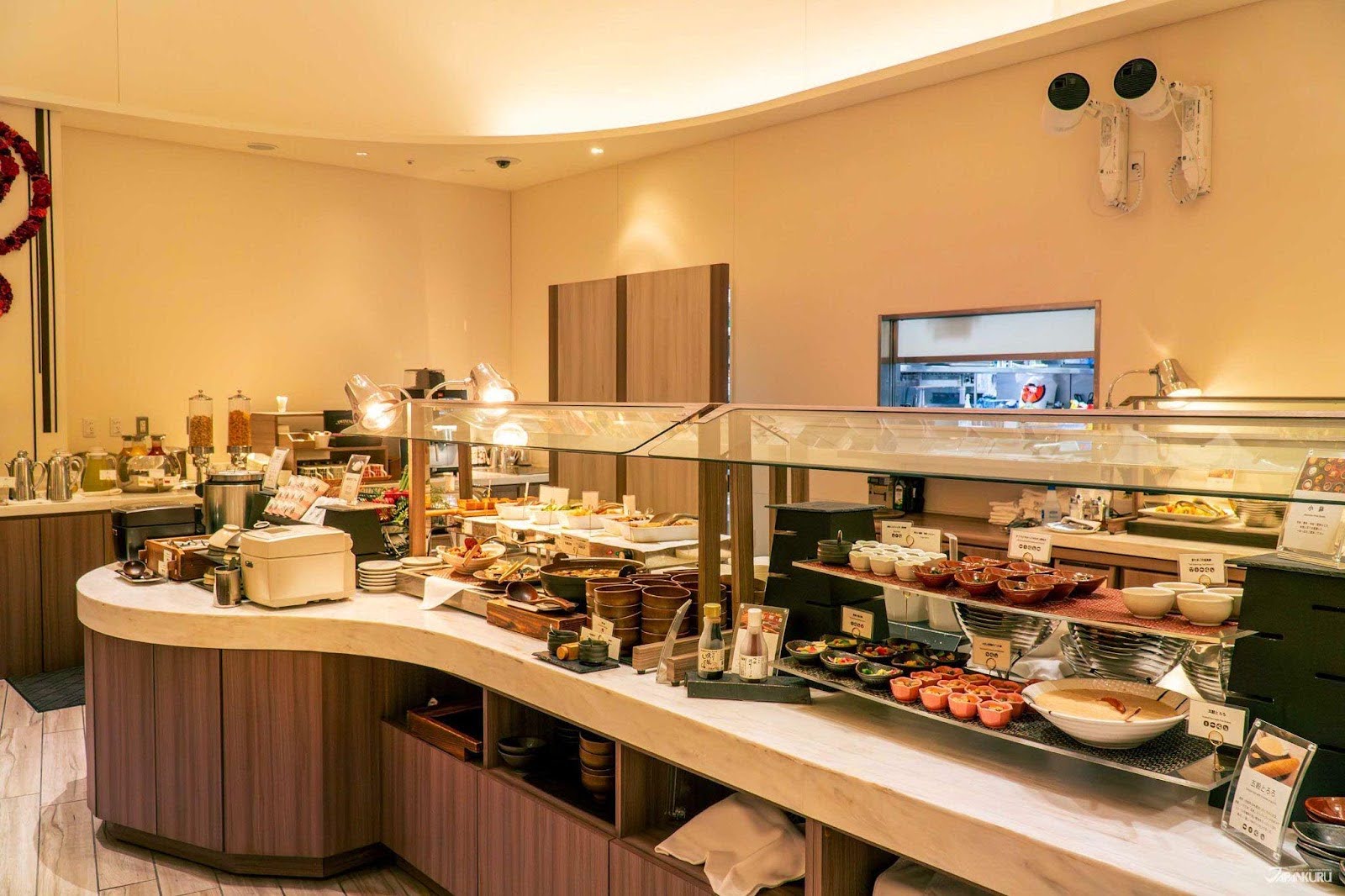 Unfortunately, the dressing isn’t available for sale, but the hotel’s custom-made coffee and tea blends are! At other times of day, the hotel cafe also offers lunch with a la carte mains, along with dinner on Saturdays. The desserts available with the lunch buffet often include seasonal specialties, like sweets made with local Amarin strawberries—specially developed by a Saitama-based research facility—available for a limited time (15 January–29 February 2024). Plus, at night, the cafe and lobby walls also serve as a huge canvas for seasonal projection mapping!