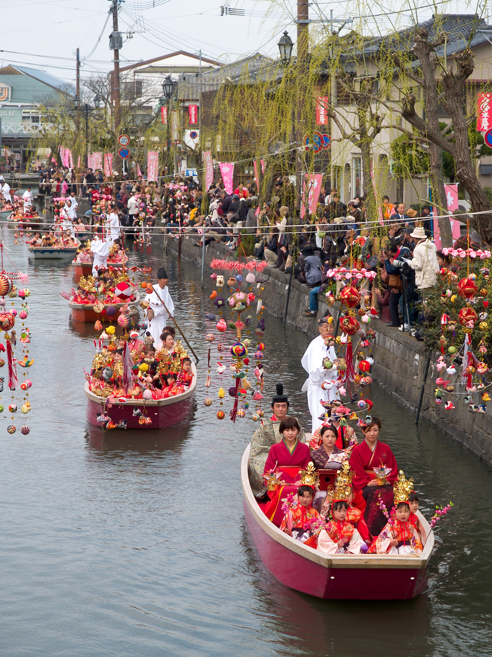Upon arrival in Yanagawa (about an hour’s train ride from Fukuoka City via express train), you emerge from a newly-renovated station building into a quiet, unassuming town. The Yanagawa Tourist Information Centre on the ground floor of the station is decorated with strings of sagemon (さげもん), colourful hoops with hanging decorations that feature little cloth rabbits, cranes, and other auspicious symbols of happiness and good luck for girls.