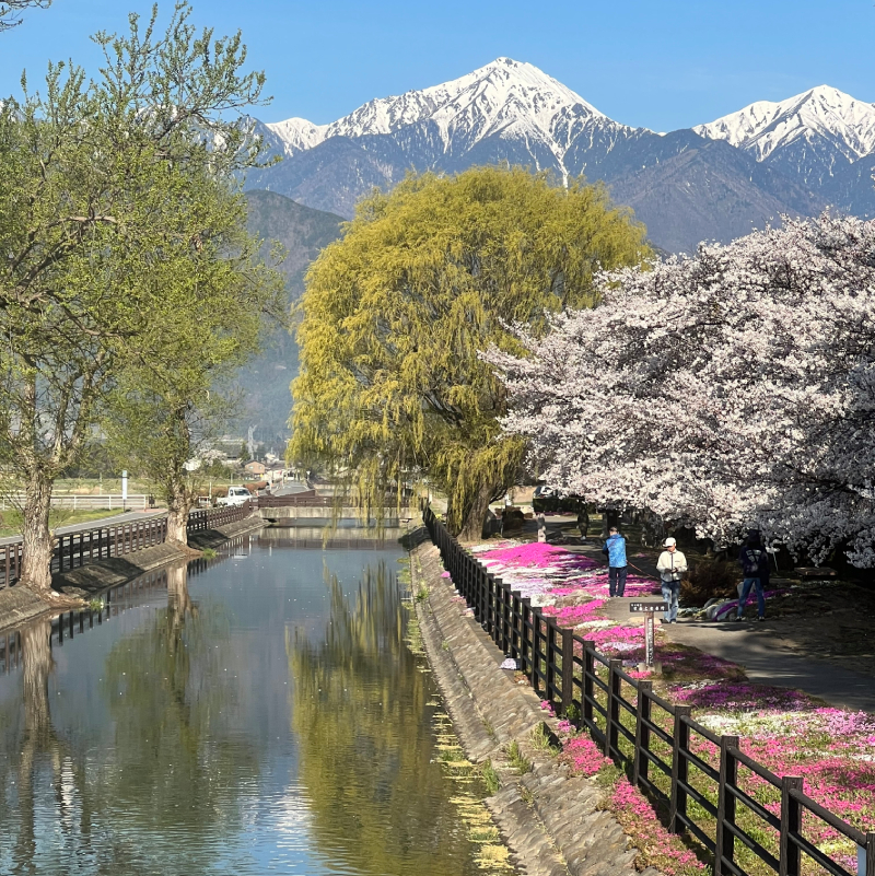 可遠眺北阿爾卑斯與開闊的田園。柔和櫻花與雄偉山景形成鮮明對比,宛如印在明信片般的美景。