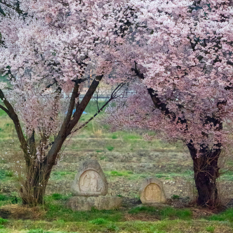 著名的石碑景點,兩側綻放的櫻花與背景的常念岳相互映襯,是安曇野最具代表性的拍照景點之一。